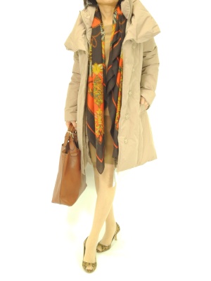 ピンクベージュのコートの下はベージュ系のプレーンワンピース。オレンジ色のストールが華やかさをプラスしてくれます!スタイリッシュ度70%、エレガンス度30%。