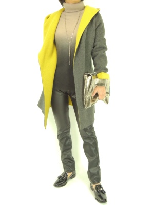 フェイクレザーのタイトなパンツがウオーム感たっぷりのニットやコートの引き締め役に!スタイリッシュ度90%、アクティブ度10%。