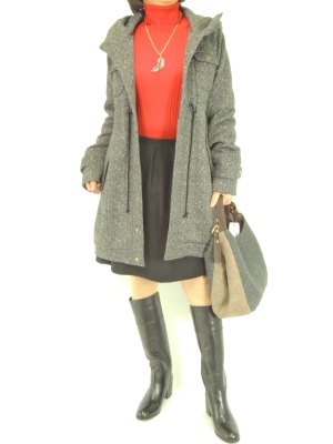 黒系コートやスカートは冬の定番ですね。差し色は綺麗な赤がおススメです!フェミニン度70%、スタイリッシュ度30%。