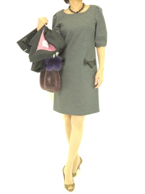 パフスリーブのワンピースは甘口コンサバなイメージ。ファー付きのバッグで少し遊び心をプラスして!エレガンス度60%、フェミニン度40%。