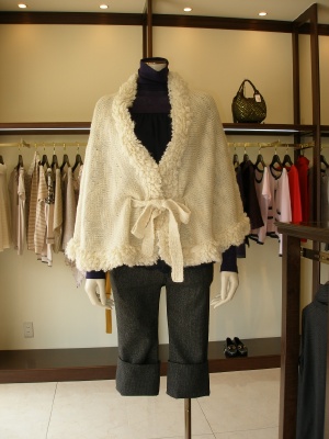 ケープのベルトは前に結んでも外してもOK。ちょっと名古屋までお買い物に・・。フェミニン度60%、スタイリッシュ度40%。
