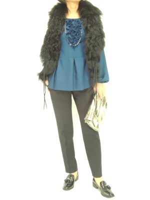 ペプラムトップスにはアンクル丈パンツを合わせるのがこの冬の新定番。ファーベストでひつ癖加えて!スタイリッシュ度100%。