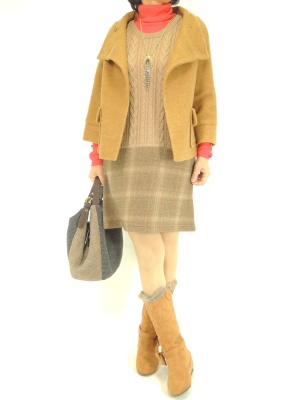 綺麗なオレンジをアクセントにした、ソフトな色合いのフェミニンコーデ。ジャンパースカート+タートルならジャケットを脱いでも可愛い!フェミニン度90%、アクティブ度10%。