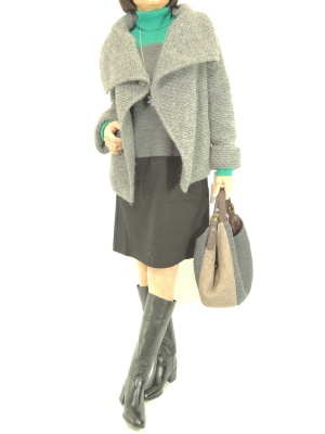 レトロ系アイテムを使ったフェミニンコーデ。甘い色を使わなくてもふんわりしたコートで可愛いイメージに!フェミニン度70%、スタイリッシュ度30%。