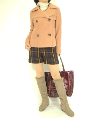 ダブルのジャケットとチェックのパンツでブリティッシュに。ショートパンツとブーツで可愛くまとめて!フェミニン度80%、アクティブ度20%。