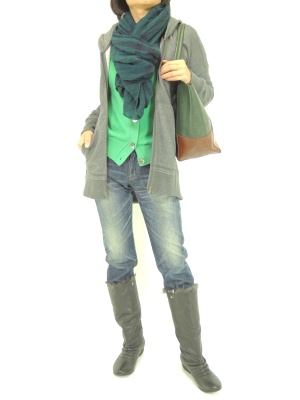 ベーシックアイテムのコーディネートはストールやブーツでラフに着崩すイメージで!アクティブ度90%、スタイリッシュ度10%。