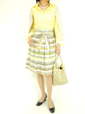 華やかなイエローで春を先取りしたコーディネート。ギャザーシャツはとても着回しの効くタイプです!フェミニン度70%、エレガンス度30%。