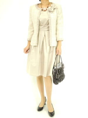 上品なベージュのワンピーススーツは入卒用におススメです!エレガンス度70%、フェミニン度30%。