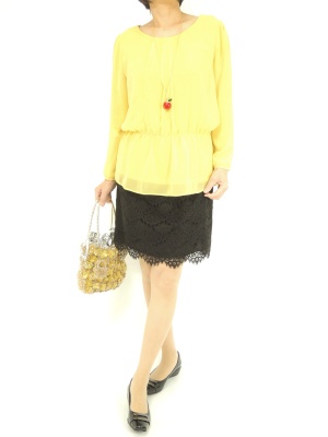 ふんわりしたイエローのブラウスは春らしさ満点。パンツも合いますが、お出かけにはレースのスカートもおススメです!フェミニン度70%、エレガンス度30%。