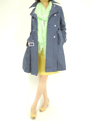 キレイ色コーデにはネイビーのコートが合わせやすい。ドット柄なら春らしくまとまります!フェミニン度80%、スタイリッシュ度20%。