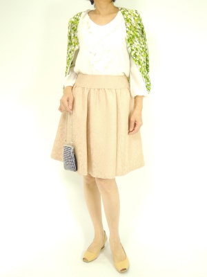 ふんわり広がるスカートとフリルブラウスの甘口コーデは、柄ものカーデで少し引き締めて!エレガンス度60%、フェミニン度40%。