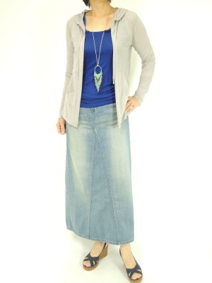 ロングスカートにはコンパクトなトップスを合わせてバランスよく。古着っぽいデニムでこなれたカジュアルに!アクティブ度100%。