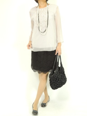 広がらないスカートならブラウスをアウトにしてもOK。ロングネックレスでさらにスッキリした印象に!フェミニン度60%、エレガンス度40%。
