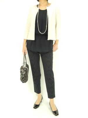 シフォンブラウスとジャガードパンツで流行を取り入れたら、ノーカラージャケットでコンサバにまとめると上品です!エレガンス度70%、スタイリッシュ度30%。