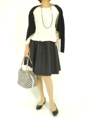 上下をふんわりまとめた時は、カーデの肩掛けで輪郭を引き締めるとスッキリまとまります!エレガンス度60%、フェミニン度40%。