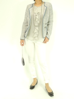 淡い色でまとめたクリーンな印象のコーディネート。ジャケットのパイピングが引き締め役です!スタイリッシュ度80%、エレガンス度20%。