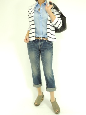 衿付きカーデとシャツで綺麗目にまとめたカジュアルスタイル!アクティブ度70%、スタイリッシュ度30%。