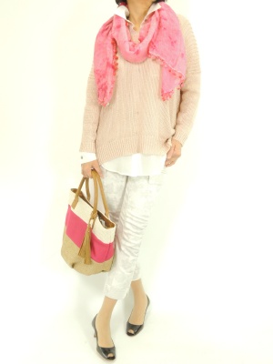 ピンクの小物をアクセントにした春らしいさわやかなコーディネート。白シャツを効かせればきりっと引き締まります!フェミニン度70%、スタイリッシュ度30%。