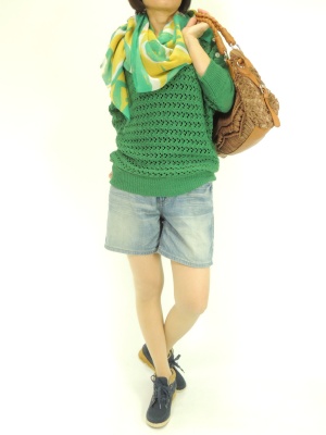 ゆるニットはショートパンツに合わせても可愛い。ストールやヒールスニーカーで大人らしい味付けを!アクティブ度90%、スタイリッシュ度10%。