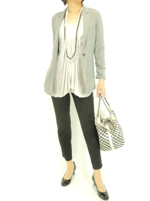 ジャケットと九分丈パンツで辛口にまとめたら、インナーは思いっきりフェミニンに!スタイリッシュ度90%、エレガンス度10%。