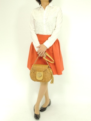 白シャツもレース使いでフェミニンな表情に。スカートは綺麗な色にすると今年らしい!フェミニン度80%、エレガンス度20%。