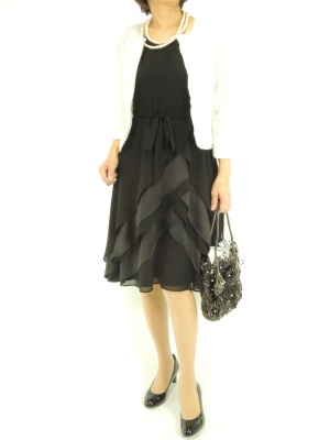 生地が重なり合うエレガントなワンピースにショート丈ジャケットがよく合います。特別な日におススメ!エレガンス度100%。