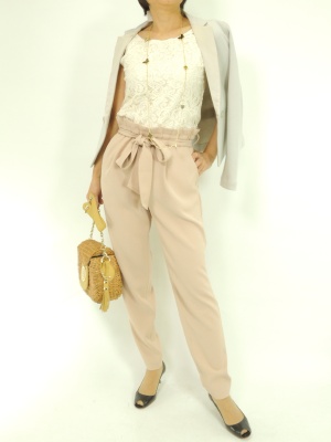 レース使いの華やかなコンビネゾン。ジャケットを羽織るだけで旬の顔に!エレガンス度60%、スタイリッシュ度40%。