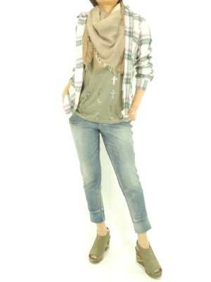 ソフトなデニムでリラックスした休日スタイル。ストールを無造作に巻けばこなれて見える!アクティブ度100%。