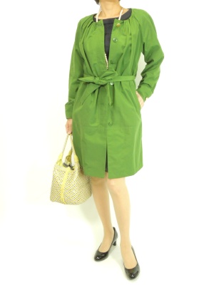 | 鮮やかなグリーンのコートで春を満喫したい。コートを脱ぐと清楚なネイビーのワンピーススタイルです!エレガンス度80%、スタイリッシュ度20%。 |