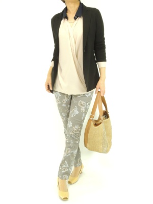 ジャケットをとろみシャツで、柄パンツも通勤使用に!スタイリッシュ度90%、エレガンス度10%。