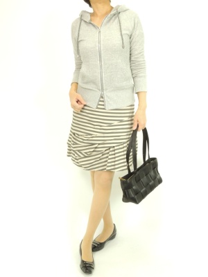 スポーティなパーカもコンパクトなタイプならフェミニンスタイルのハズシに使えます!フェミニン度70%、アクティブ度30%。