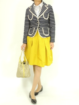 ボーダー×ドットの柄物コーデも紺×白ならスッキリまとまる。スカートのイエローを指し色にしたフェミニンなマリンルック!フェミニン度60%、スタイリッシュ度40%。