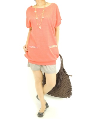 キレイ色のゆったりニットはポケットと後ろのリバティー柄に注目。ショートパンツでシンプルに着こなして!フェミニン度70%、アクティブ度30%。