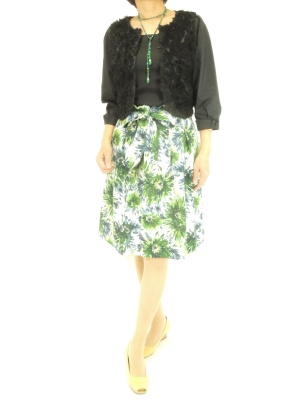 ワンピースに合わせることが多いショート丈ジャケットはウエストマークしたスカートにもよく合います!エレガンス度70%、フェミニン度30%。