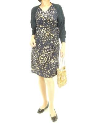 大人っぽいカシュクールワンピは星柄が新鮮。ざっくりニットのボレロで少しカジュアルに!エレガンス度70%、スタイリッシュ度30%。