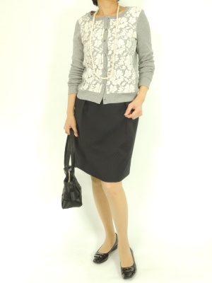 レースを使った上品なカーディガンは着やすいカットソー素材。シックなスカートを合わせると、ちょっとお出かけにも!フェミニン度60%、エレガンス度40%。