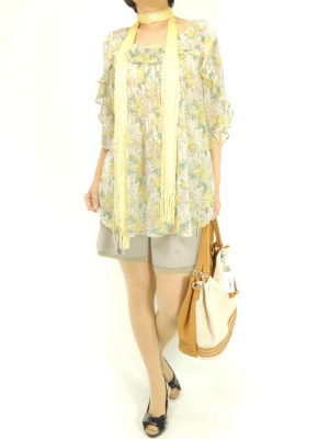 フリル+花柄の甘口ブラウスはショートパンツですっきり着こなして。細いストールがスタイルアップのカギです!フェミニン度80%、アクティブ度20%。