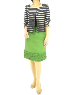 スカートの綺麗なグリーンが目を引くワンピース。ボーダーのジャケットで少しはマリンな気分に!エレガンス度70%、フェミニン度30%。