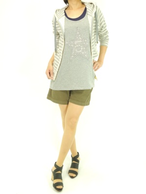 ショートパンツをパーカでボーイッシュに着こなすなら、インナーはAラインのタンクトップで可愛らしさをプラスして!アクティブ度90%、フェミニン度10%。