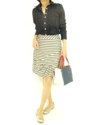 重ね着しないシンプルコーデの時はデザインに一癖あるアイテムを選びたい!フェミニン度70%、スタイリッシュ度30%。