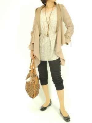 フード付きカジュアルなジャケットですが、ドレープがエレガントなので大人っぽく着こなせます!スタイリッシュ度80%、アクティブ度20%。