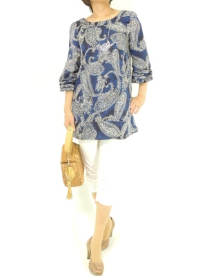 シックなペイズリー柄のチュニックはちょっとしたお出かけにもピッタリ。白パンツとかごバックで季節感を出して!フェミニン度60%、スタイリッシュ度40%。