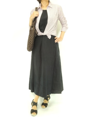 麻のナチュラルマキシはシャツを裾で結んで上半身をコンパクトにまとめて!アクティブ度90%、スタイリッシュ度10%。