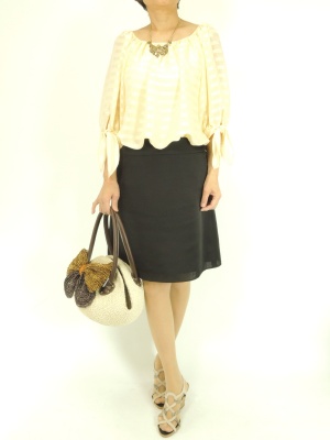 ふんわりしたトップスがエレガントなトリックワンピース。かごバッグとサンダルを合わせれば固すぎないお出かけスタイルに!エレガンス度90%、フェミニン度10%。