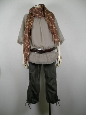 フェミニンなシフォンのトップスには、対照的なカーゴパンツを合わせるとオシャレ。アニマル柄ストールでサファリー風にまとめて颯爽と!スタイリッシュ度90%、アクティブ度10%。