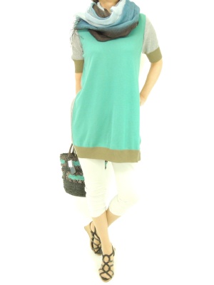 カラーブロックのチュニックをライトベージュのレギパンで色をより綺麗に見せて!アクティブ度60%、スタイリッシュ度40%。