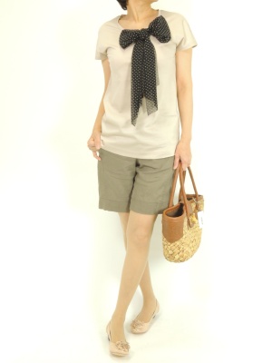 リボンが可愛いカットソーには、あえてボーイッシュなショートパンツを合わせて甘さを調節して!フェミニン度70%、アクティブ度30%。