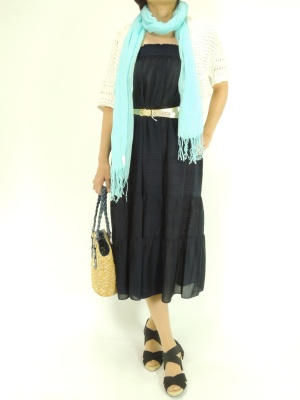 マキシスカートをベアワンピにアレンジした着こなし。ボレロやベルトで全身をコンパクトにまとめて!エレガンス度60%、スタイリッシュ度40%。