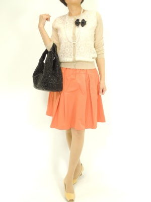 レースが上品なカーディガンはボタンを閉じて一枚で着てもお洒落。ブライトカラーのスカートも優しい印象になります!フェミニン度70%、エレガンス度30%。