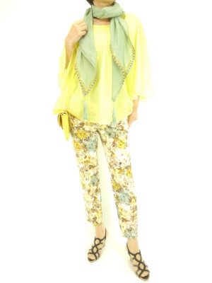 イエローでまとめたコーディネートはこの春夏のトレンドです。ストールや華奢なサンダルで大人っぽく着こなしたい!スタイリッシュ度90%。、アクティブ度10%。
